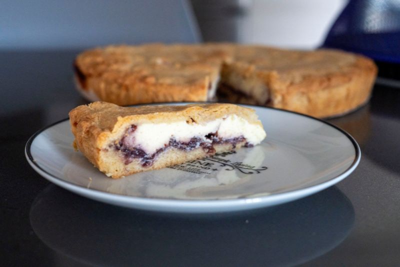 - Spread the bottom with 320 grams (11.29 oz) sour cherry jam, then top with the ricotta mixture.